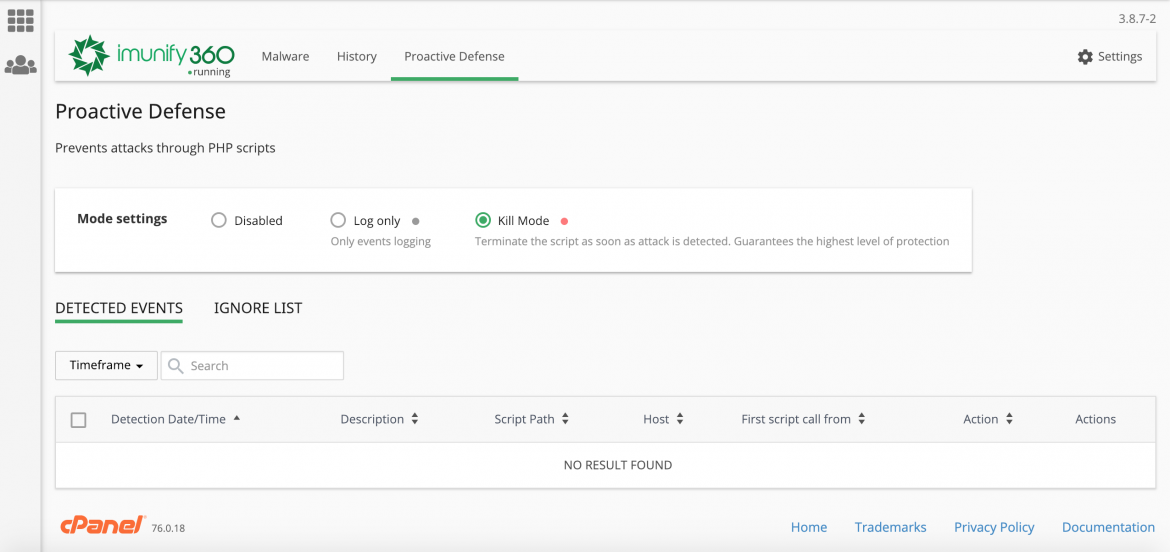 Nesta fase, já temos Imunify360 ativo e sempre que for detetada alguma ameaça, será desencadeada a ação que predefiniu.